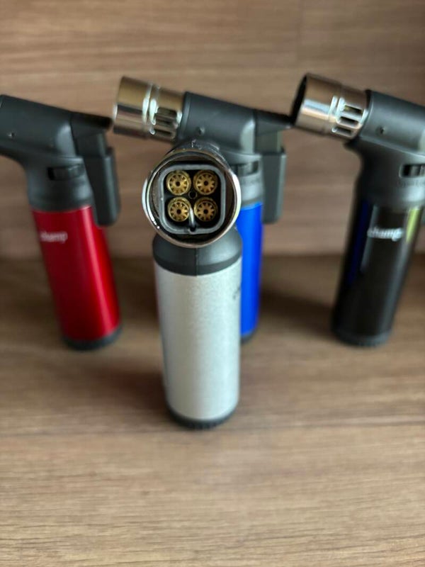Een aansteker van het merk Champ met vier pitten. Kenmerken: - Vier x een vlam van 1300°C - Windproof - Hervulbaar - Afmetingen (lxbxh): 12,5 x 7 x 3 cm. Nu 4 stuks voor een extra voordelige prijs.